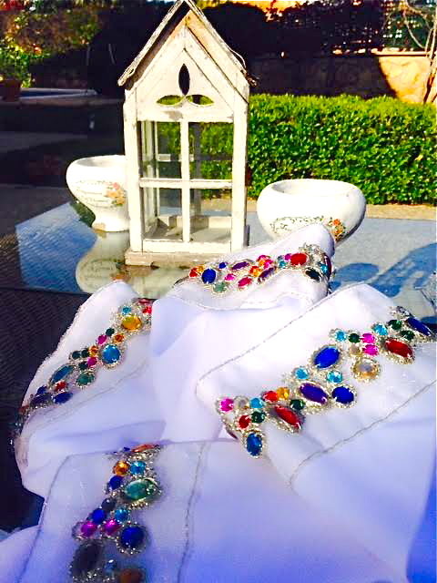 La blusa es de manga francesa con unos detalles de piedras en colores ribeteados en plata. Una apuesta diferente al blanco total y muy ponible a pesar de los detalles.
